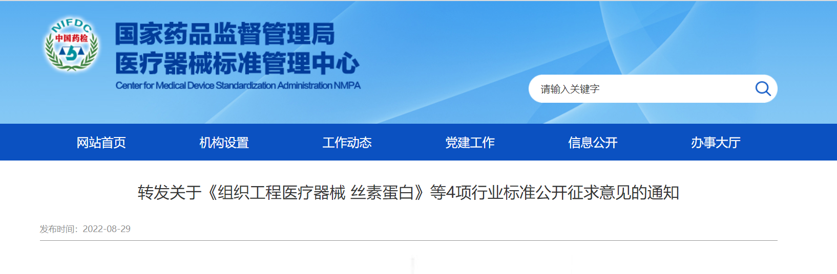隨著絲素蛋白醫(yī)療器械產(chǎn)品的增加,對(duì)這一材料的生產(chǎn)制備、質(zhì)量控制等提出了要求。相對(duì)于產(chǎn)業(yè)的迅速發(fā)展,絲素蛋白相關(guān)標(biāo)準(zhǔn)在國(guó)際國(guó)內(nèi)仍處于空白。由于標(biāo)準(zhǔn)的缺乏,各絲素蛋白企業(yè)在企業(yè)標(biāo)準(zhǔn)制定過(guò)程中無(wú)統(tǒng)一的標(biāo)準(zhǔn)參考依據(jù),限制了絲素蛋白醫(yī)療產(chǎn)業(yè)的高質(zhì)量發(fā)展。目前,為提高絲素蛋白材料的質(zhì)量與安全性,為科學(xué)監(jiān)管提供支撐,由全國(guó)外科植入物和矯形器械標(biāo)準(zhǔn)化技術(shù)委員會(huì)組織工程醫(yī)療器械產(chǎn)品分技術(shù)委員會(huì)歸口的《組織工程醫(yī)療器械絲素蛋白》已形成征求意見(jiàn)稿[5],并于2022年8月23日-2022年10月24日期間公開征求意見(jiàn)。