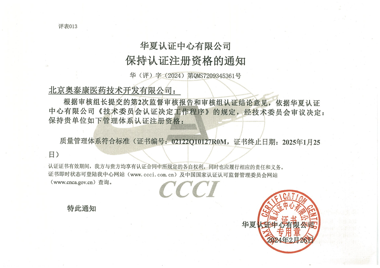 近日,北京奧泰康醫(yī)藥技術(shù)開發(fā)有限公司經(jīng)華夏認(rèn)證中心有限公司(CCCI)認(rèn)證,順利通過ISO9001:2015 標(biāo)準(zhǔn)質(zhì)量管理體系認(rèn)證年度審核,認(rèn)證范圍為醫(yī)療器械臨床試驗及產(chǎn)品注冊服務(wù)。