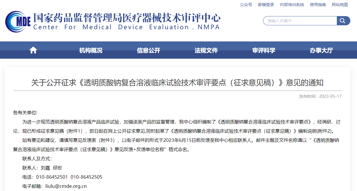 ▲ 《透明質(zhì)酸鈉復(fù)合溶液臨床試驗技術(shù)審評要點(征求意見稿)》 (來源:器審中心)
