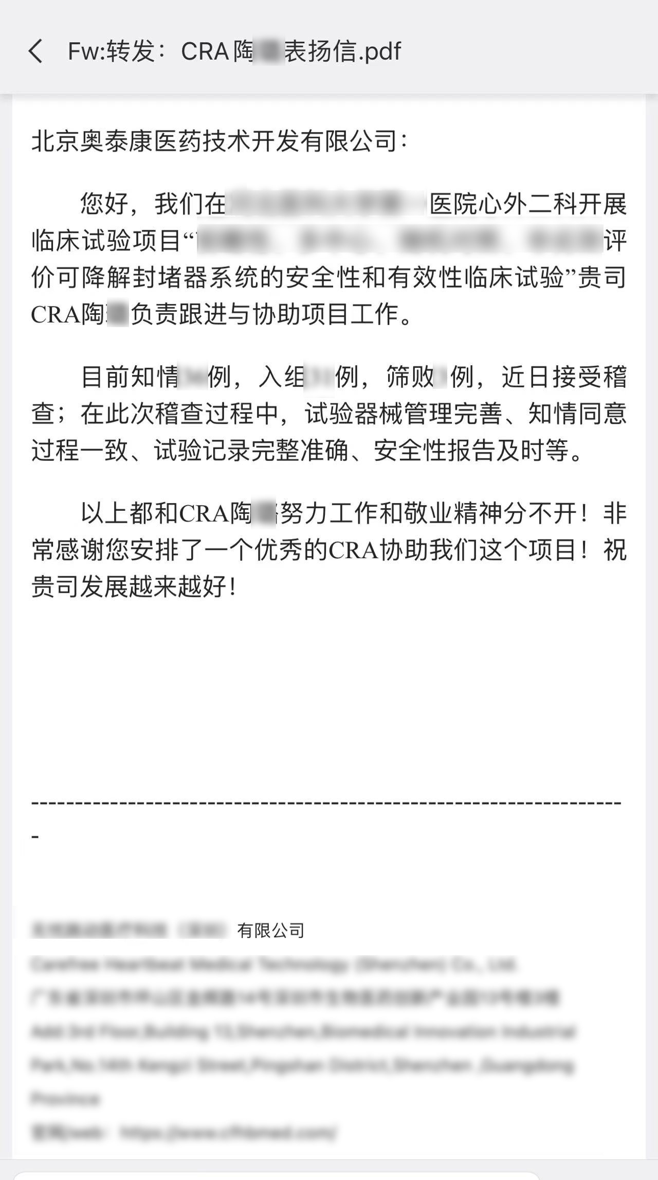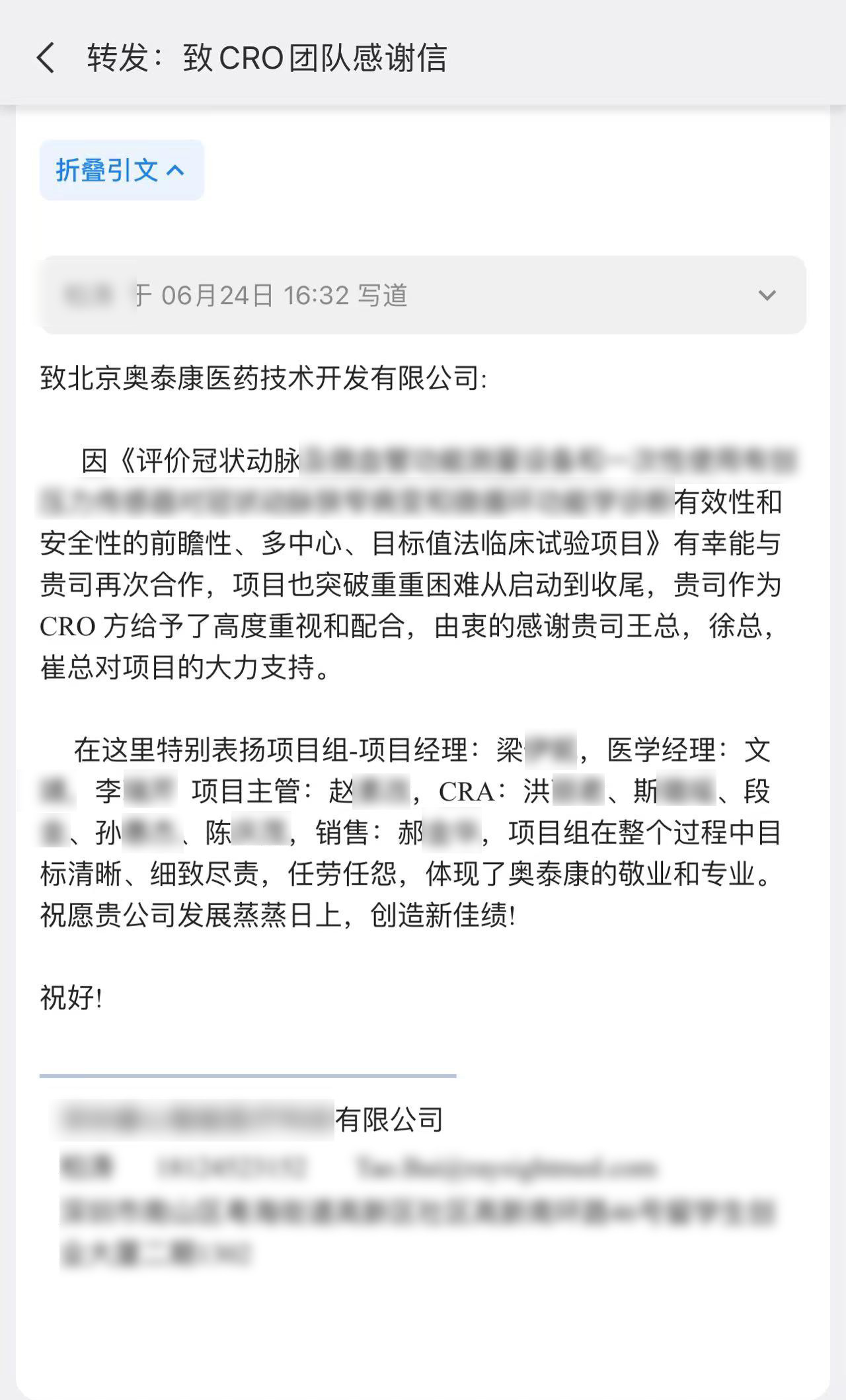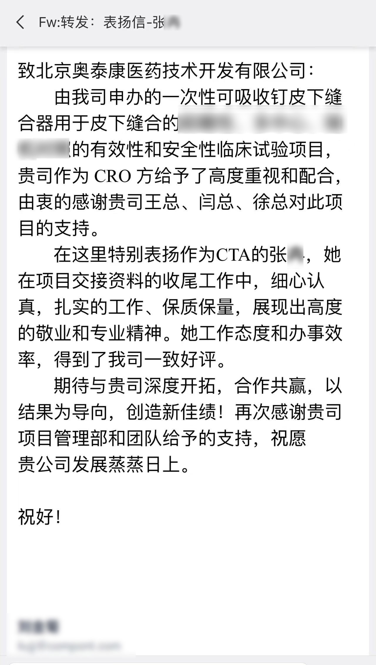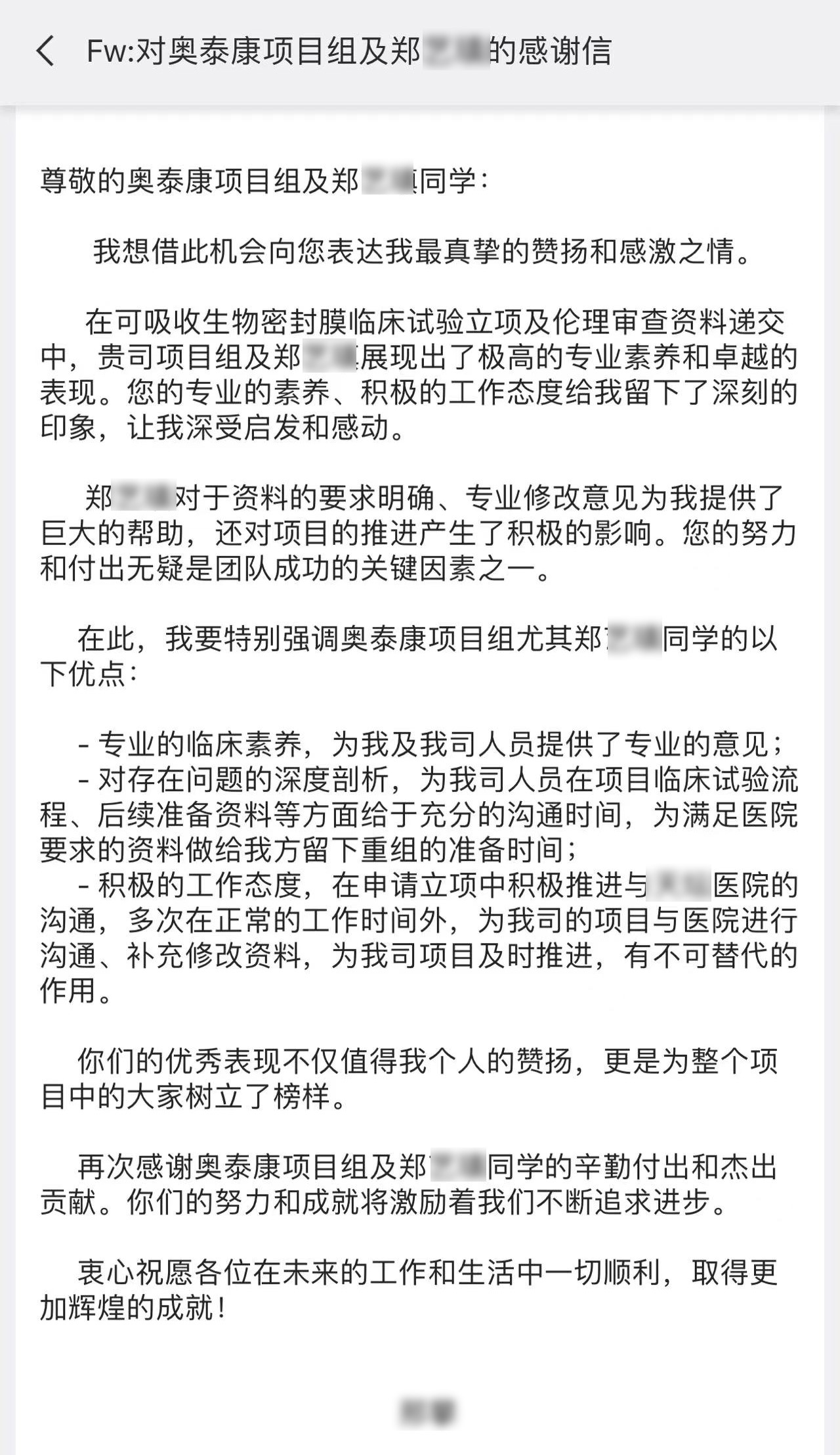 每一個(gè)項(xiàng)目的推進(jìn)離不開(kāi)臨床團(tuán)隊(duì)的共同努力,一年過(guò)半,奧泰康陸續(xù)收到了多封來(lái)自合作伙伴的感謝信和表?yè)P(yáng)信,信中對(duì)奧泰康人在臨床試驗(yàn)項(xiàng)目中的表現(xiàn)給予高度肯定。我們也對(duì)他們致以由衷的敬意,感謝他們?yōu)橥七M(jìn)產(chǎn)品上市付出的不懈努力,讓我們共同查收這些信件吧~