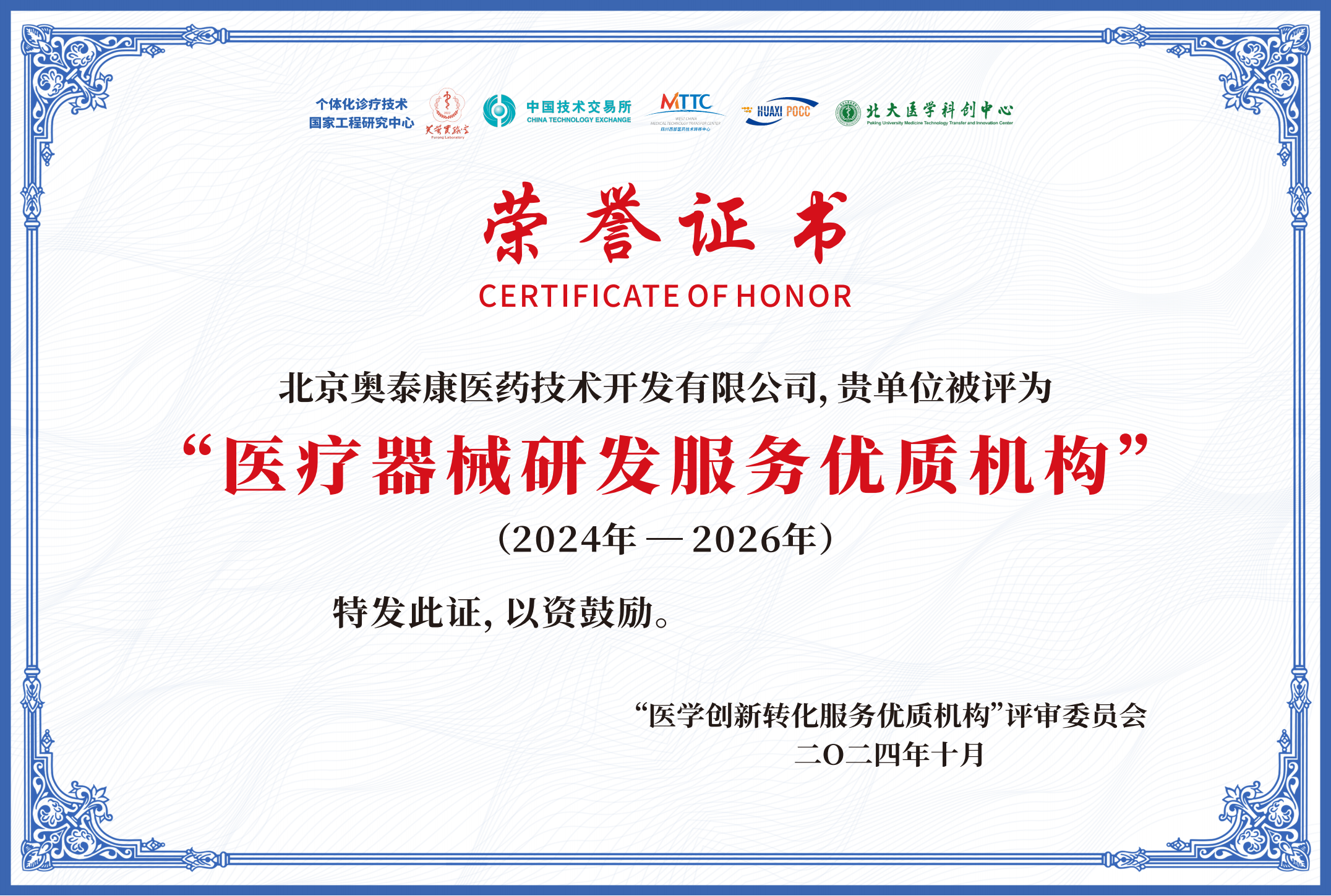 個(gè)體化醫(yī)學(xué)研討會(huì)暨第四屆衛(wèi)生健康創(chuàng)新與轉(zhuǎn)化管理論壇落幕 ——奧泰康獲評2024年度“醫(yī)療器械研發(fā)服務(wù)優(yōu)質(zhì)機(jī)構(gòu)”???