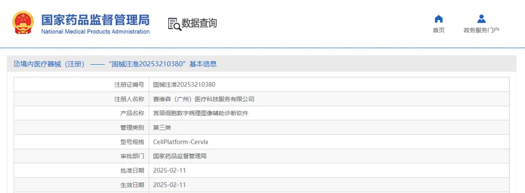 賽維森科技自主研發(fā)的“宮頸細(xì)胞數(shù)字病理圖像輔助診斷軟件”,正式獲得國家藥監(jiān)局(NMPA)頒發(fā)的第三類醫(yī)療器械注冊證,是宮頸細(xì)胞學(xué)領(lǐng)域首張“輔助診斷”三類證。人工智能正式升級為醫(yī)生的“超級助手”?。ㄗ宰C編號:國械注準(zhǔn)20253210380)