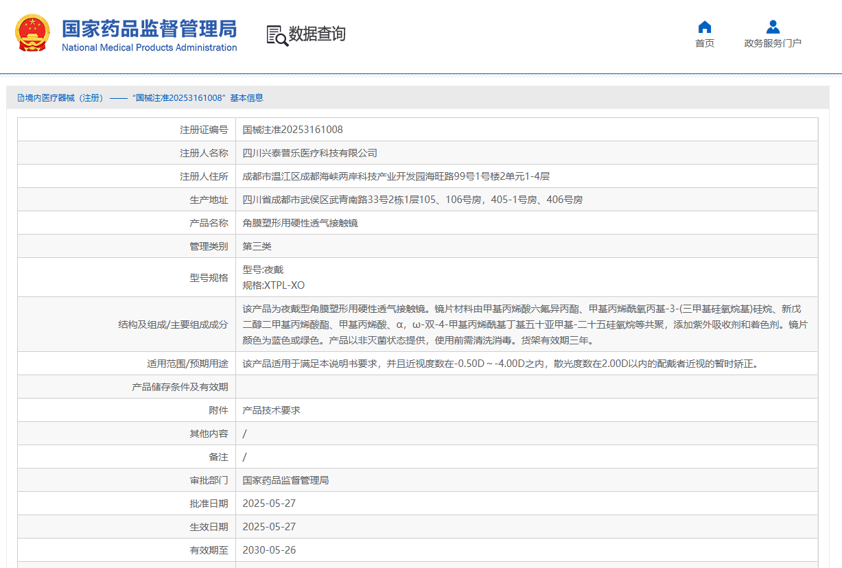 奧泰康助力興泰普樂「角膜塑形用硬性透氣接觸鏡」獲批上市2025年5月27日,經(jīng)國家藥品監(jiān)督管理局公示,四川興泰普樂醫(yī)療科技有限公司的角膜塑形用硬性透氣接觸鏡(國械注準(zhǔn)20253161008)獲得NMPA批準(zhǔn)上市,奧泰康負(fù)責(zé)本項(xiàng)目臨床試驗(yàn)工作。