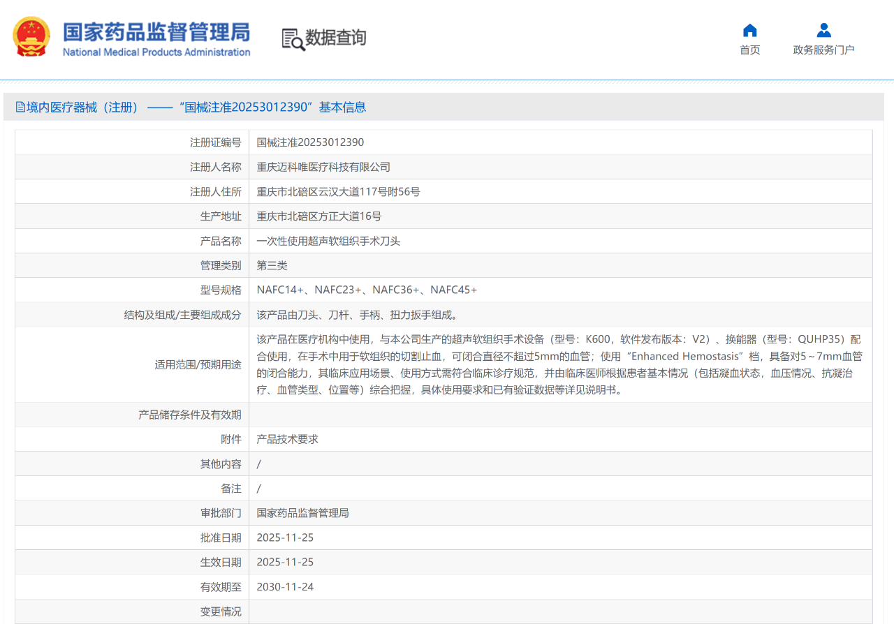 MA成果[慶祝]奧泰康助力邁科唯「一次性使用超聲軟組織手術(shù)刀頭」獲批上市[煙花]系本年度助力獲得的第14張三類注冊證??2025年11月,經(jīng)國家藥品監(jiān)督管理局公示,重慶邁科唯醫(yī)療科技有限公司研發(fā)的一次性使用超聲軟組織手術(shù)刀頭(國械注準(zhǔn)20253012390)獲得NMPA批準(zhǔn)上市,奧泰康提供市場準(zhǔn)入MA解決方案。