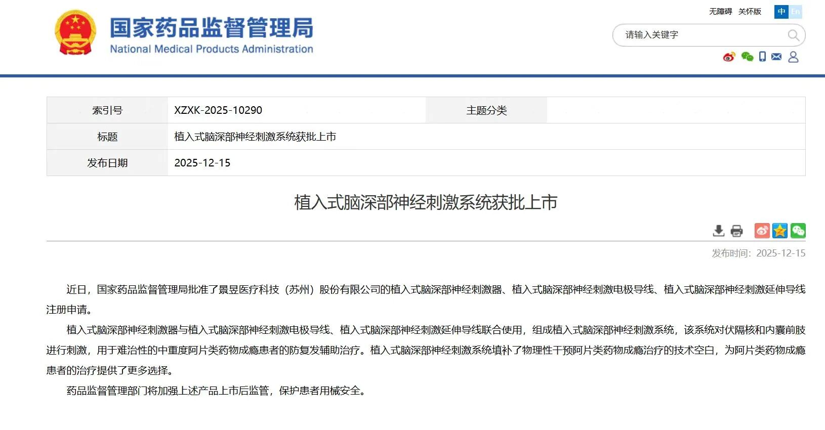 2025年12月15日,經(jīng)國(guó)家藥品監(jiān)督管理局公示,景昱醫(yī)療科技(蘇州)股份有限公司的植入式腦深部神經(jīng)刺激器(國(guó)械注準(zhǔn)20253122580)及植入式腦深部神經(jīng)刺激延伸導(dǎo)線產(chǎn)品獲得NMPA批準(zhǔn)上市,奧泰康提供MA解決方案。