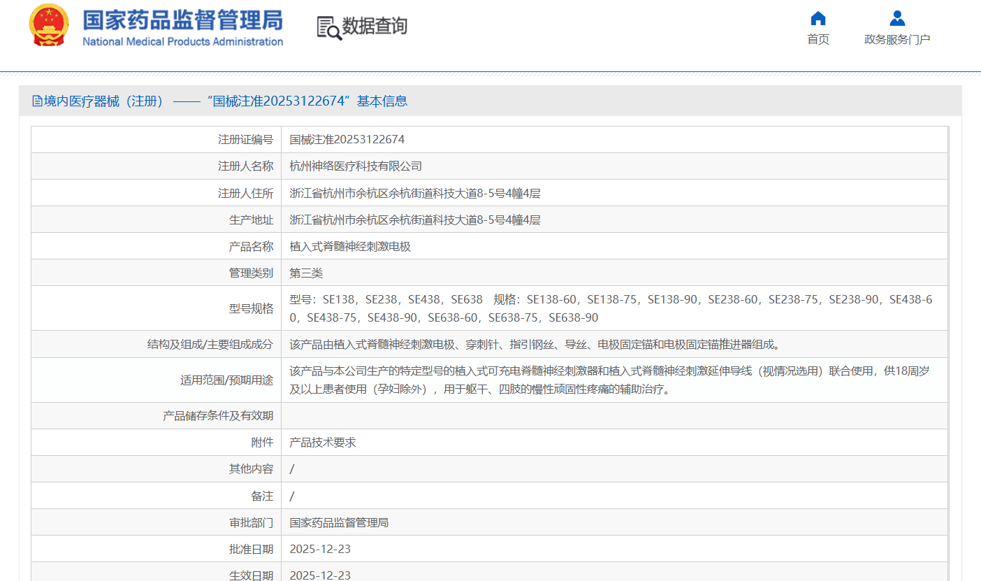 近期,經(jīng)國家藥品監(jiān)督管理局公示,杭州神絡醫(yī)療科技有限公司自主研發(fā)的產(chǎn)品植入式脊髓神經(jīng)刺激電極(國械注準20253122674)獲得NMPA批準上市,奧泰康提供MA解決方案。