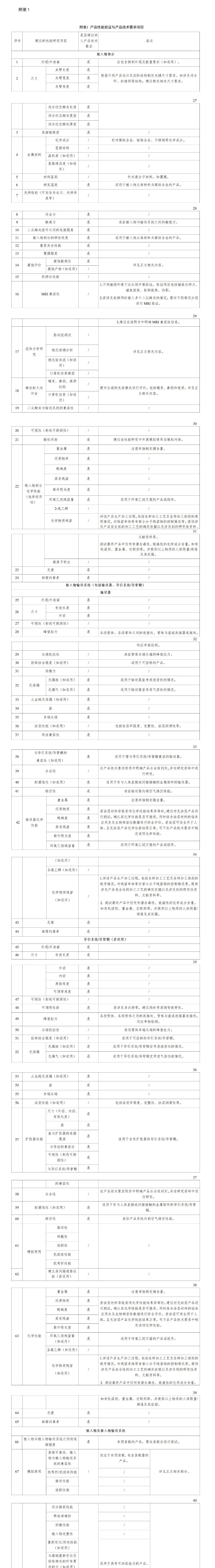 產(chǎn)品技術(shù)要求性能指標可參考表1制定,如有不適用條款,申請人應(yīng)在申報資料中說明理由。如產(chǎn)品有特定設(shè)計,申請人還應(yīng)根據(jù)產(chǎn)品設(shè)計特征設(shè)定相應(yīng)的性能指標,并將其列入產(chǎn)品技術(shù)要求。若有隨產(chǎn)品一起申報的附件,無論附件是否已取得醫(yī)療器械注冊證,均應(yīng)將附件的性能指標制定在產(chǎn)品技術(shù)要求中。對于可進行客觀判定的成品定性或定量的功能性、安全性指標,應(yīng)將其列入產(chǎn)品技術(shù)要求。