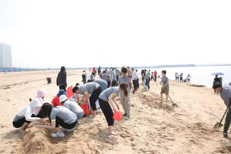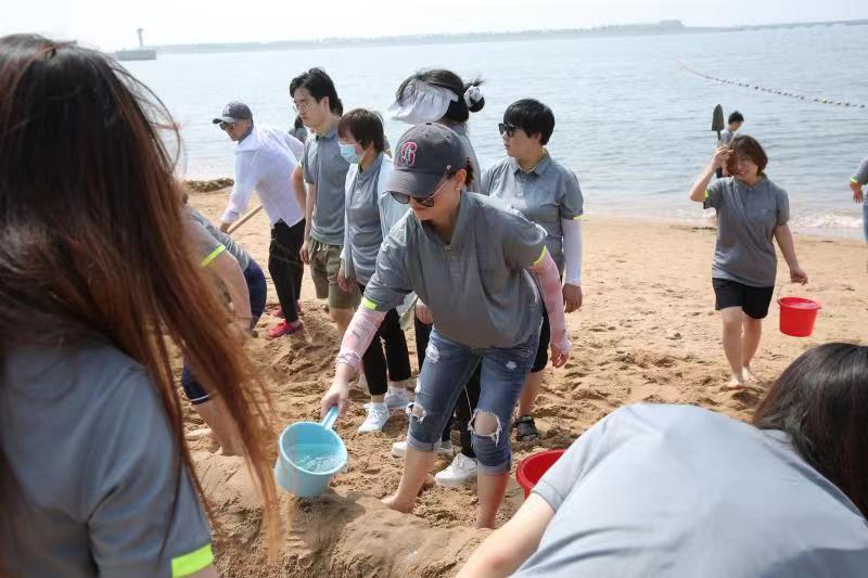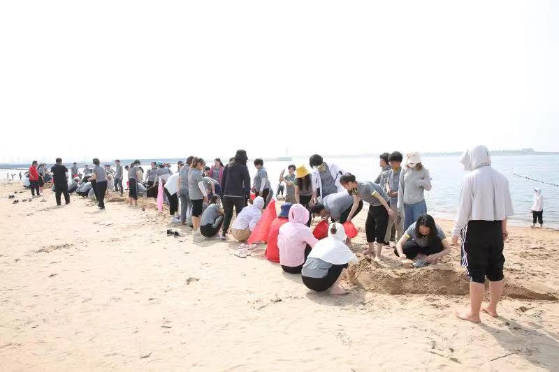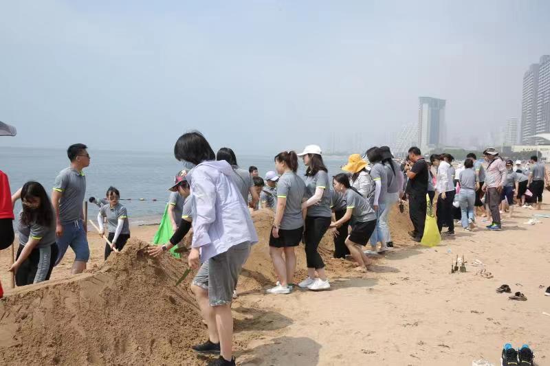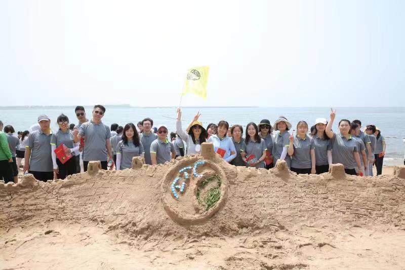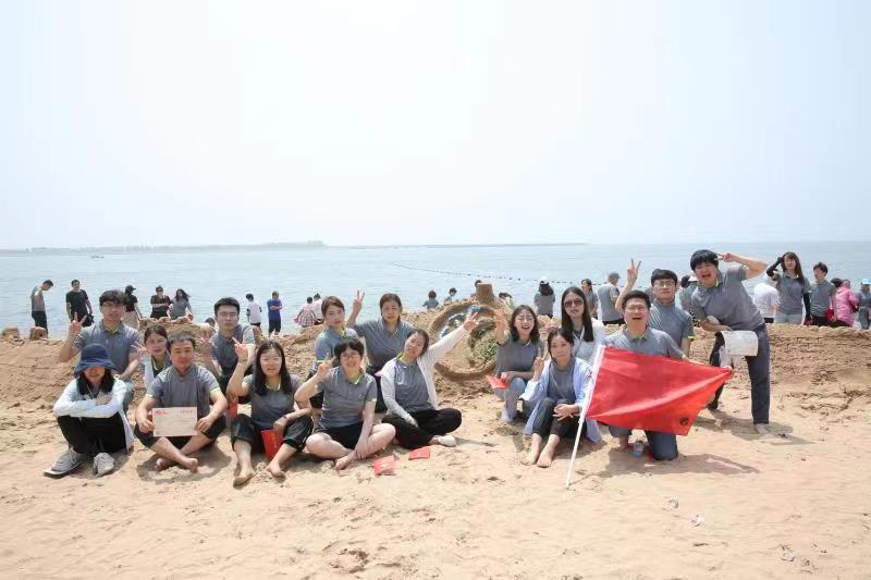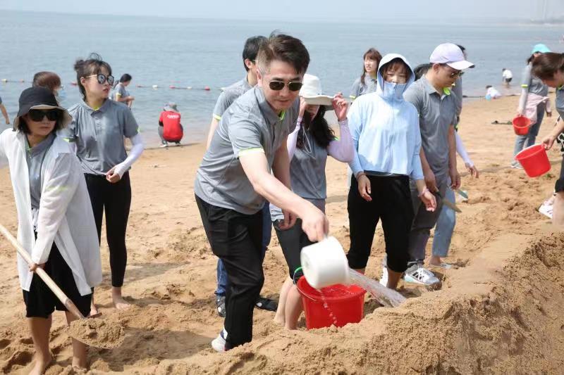 海邊沙灘,全體奧泰康人共同構(gòu)筑了一座長40余米、高1米的沙雕長城,每組隊員分工明確—鏟沙、運水、堆砌,聚沙成塔,經(jīng)過兩小時的共同搭建,眾志成城,一座巍峨壯闊的沙雕長城矗立在沙灘上。